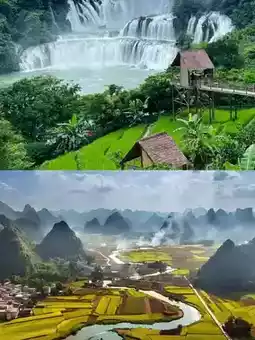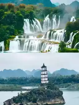 1. Detian Transnational Waterfall: Asia's largest transnational waterfall, spanning China and Vietnam, features magnificent cascades with thunderous roars. Taking a bamboo raft is recommended for a close-up experience of the waterfall's grandeur while enjoying views of Vietnam across the water. Best visiting time is 11:30 - 14:30 when upstream water is released, making the waterfall most spectacular.