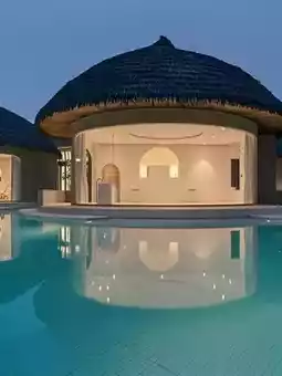 🔹 Standalone mushroom villa with 180° floor-to-ceiling windows facing the pool and banana grove, feels like Southeast Asia