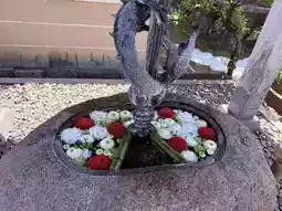In addition to the wisteria, the temple grounds feature scattered azaleas and other flowers, as well as beautiful floral water basins.