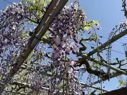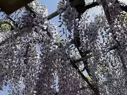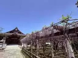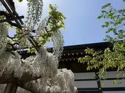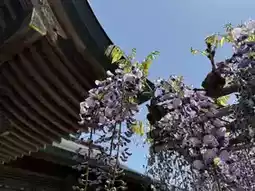 The 'Wisteria of the Lying Dragon' is a purple wisteria. When I visited in late April, about 50% of the flowers had bloomed, with roughly 1/2 to 1/3 of the clusters still in bud form. Full bloom is expected around late April or early May. Besides the Lying Dragon wisteria, the temple also has another smaller wisteria trellis, which was about 80-90% in bloom during my visit, with almost no gaps between the flowers and leaves.