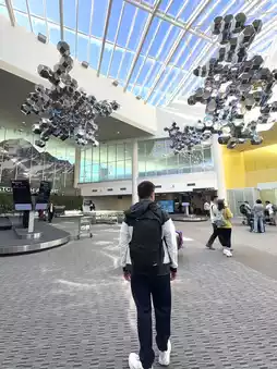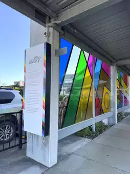There are some artistic elements outside the airport, with colorful glass windows and round decorations.