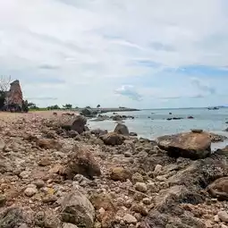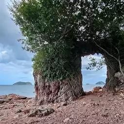 This naturally formed stone gate offers views of the sea and various islands. It's quite unique and peaceful, with white sand, clear water, and few people. Nearby are shops and restaurants.