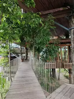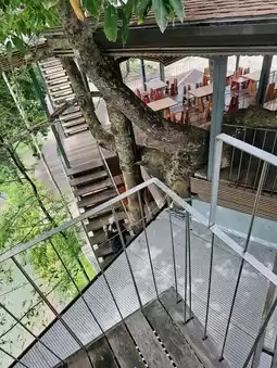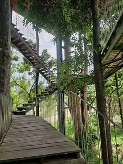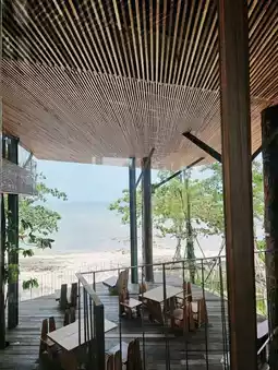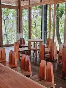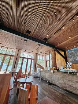 A trending cafe in Chumphon Province, "Baan Ton Mai Aw Chum," a café nestled atop a rubber tree, blends nature with architecture perfectly. A large fountain nestles in the center, offering both air-conditioned and sea-breeze areas. The cafe is right on the beach, allowing you to stroll down or watch the waves from the second and third floors. The lighting is excellent, and there are plenty of photo opportunities.