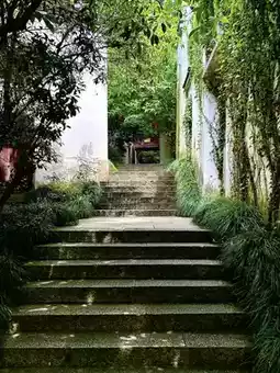 🔘 Watch out for caterpillars dangling from silk threads on the stone steps to Kuixing Pavilion.