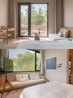 The room designs are eye-catching, each with its own distinctive style. Natural materials like wooden furniture and linen fabrics dominate the interiors, paired with warm lighting to create a cozy and inviting atmosphere. From the windows, you’ll either gaze at the vast, shimmering Qiandao Lake with boats gliding by or the verdant, vibrant forests.