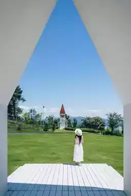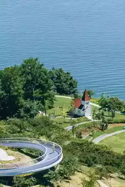 The red-roofed chapel, rainbow walkway, deer sculptures,