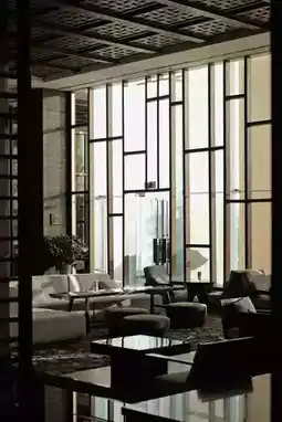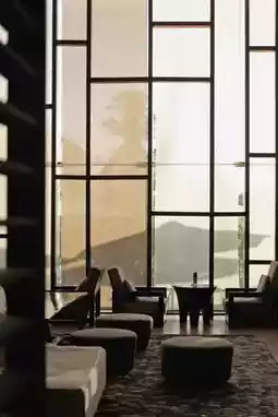 The hotel’s Starry Corridor presents different scenes at different times of the day. The hollow metal canopy filters sunlight during the day, casting mottled shadows; at nightfall, warm yellow lights turn on, weaving a dreamy light waterfall with the deep blue lake and night sky.