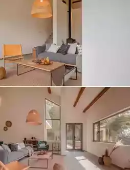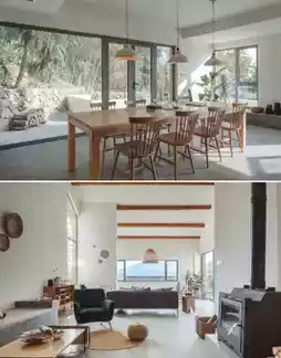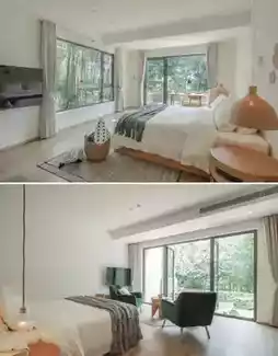 The hotel has a total of 25 rooms distributed across four villas, most equipped with oversized glass windows and terraces/courtyards. The rooms continue the light color scheme design, with solid wood furniture, cotton and linen materials, and floor heating systems creating a warm and comfortable living experience.