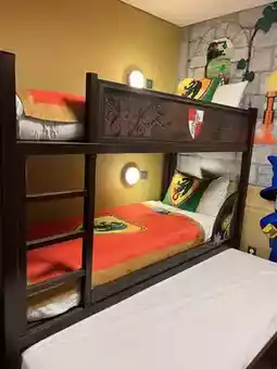 Upon entering the Kingdom Room, the first thing that greets the children is the bunk bed. It is decorated like a small space just for them, where they can play or enjoy themselves until bedtime. Especially, the area under the bunk bed has fun pictures and Lego-themed decorations on the wall, giving the feeling of staying in a fairy tale castle.