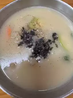 • The soup is thick and has a rich perilla flavor, and is served with pickled radish and radish kimchi,