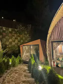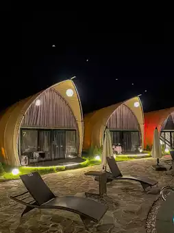 the glamping rooms are duplex, with a bedroom on the first floor and a hammock and sofa on the second, perfect for relaxing evenings watching movies with the projector!