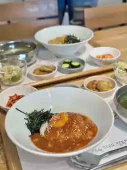 The lunch set includes rice, soup, two side dishes, and a salad. This luxurious bibimbap features blue crab roe and crab miso mixed with a sweet and spicy sauce ✨️. Breaking the egg on top adds a creamy texture, making it irresistible to stop eating 🩵.