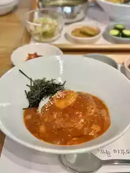 The spiciness is moderate, offering a perfect balance of heat and flavor. The set also comes with side dishes like Korean pancakes, kimchi, and seaweed soup, making it a well-rounded meal.
