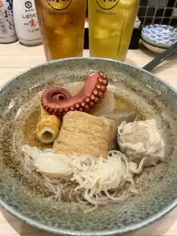 This is my second visit to this popular restaurant that serves all-you-can-eat oden for 550 yen. I stopped by when I was traveling in Fukuoka, and the restaurant was very busy even though it was a weekday, so it seems better to make a reservation on weekends. First, a full set of oden was served as an appetizer 🍢 The octopus was bigger than I expected, plump and delicious. The shumai recommended by the restaurant staff was also quite tasty. There is an oden corner in the middle, and you can take a plate and have more. I especially enjoyed the delicious octopus and shumai, so I had to have more than one. The restaurant has a counter, tables, and a room that looks like a private room. The staff are very energetic and nice. It's a shame that I couldn't eat or drink much because I had eaten and drank a lot at the first place. Next time, I'd like to eat a lot on an empty stomach lol Thank you for the meal. Menu ordered: Oden 550 yen All-you-can-eat sweet potato with butter and honey 480 yen Yakitori 5-piece set (ponjiri, chicken thigh, gizzard, chicken neck, chicken skin) 890 yen Black oolong tea Jasmine tea