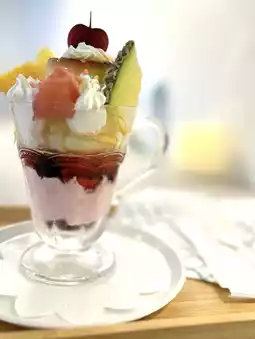 Inside the glass are vanilla ice cream, strawberry ice cream, mixed berries, melon, cherry, etc. It was a delicious and filling parfait