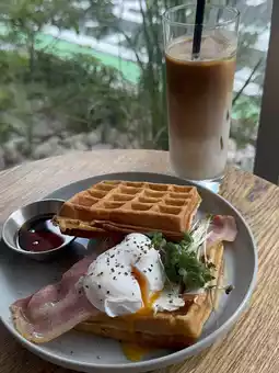 Recommended! BACON EGG Waffle (1,400 yen): A freshly baked waffle topped with a poached egg, crispy bacon, cream cheese, sprouts, and maple syrup. The slightly sweet waffle base pairs perfectly with the savory toppings and maple syrup for a delicious combination.