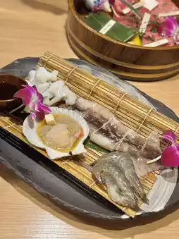 This is a luxurious seafood platter that includes scallops, squid, and shrimp✨