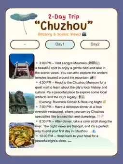 a peaceful and charming getaway in Anhui Province? Chuzhou offers a perfect combination of nature, history, and local culture for a relaxed two-day trip. ๐๏ธ๐ Hereโs a chilled itinerary for you to enjoy the best of Chuzhou without feeling rushed. โจ
