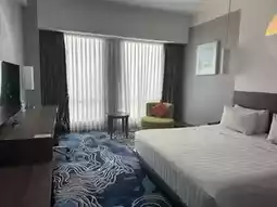 Amenities: There is bathtub, fridge in the room. Gym, SPA and swimming pool at level 1. At hotel lobby, there is a cake/pastries corner for purchasing cakes, if you have sweet tooth. Opposite the hotel there is a cafe and Bakso soup stall, as well as pharmacy and convenience store.