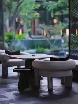 My favorite is strolling through the garden downstairs in the afternoon, with bluestone slabs winding around a small creek, copper bells chiming in the wind, and the scent of Longjing tea mingling with the aroma of plants drifting over. Looking up at the large flat, light gray stone paired with natural wood window frames blends with green trees and flowing water to form a painting—every casual photo looks like a movie still.