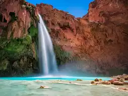 Havasu Falls is a stunning waterfall located in the Havasupai Indian Reservation in Arizona, USA. Known for its turquoise blue waters and dramatic drop, it is one of the most beautiful and photographed waterfalls in the world. The falls are part of Havasu Creek, which flows into the Grand Canyon. Bring a lot of water and wear comfortable shoes. Enjoy your trip!