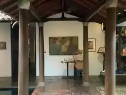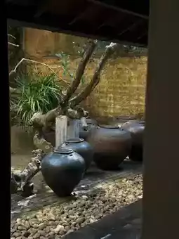 Through the corridor in front of the left side of the pool, you will enter a relatively open courtyard with coffee seats, which is also the main scene of the whole building. There is no air conditioning, only ceiling fans, surrounded by lush greenery, blending with nature, with a tropical style. In front of one side of the wall, there are several large jars (Bawa likes to use large jars as landscape decorations), with unexpected and wonderful effects.