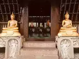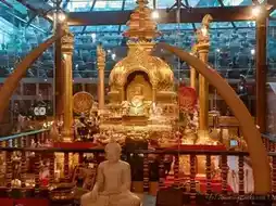 - **The Main Shrine:** A **golden Buddha** sits under a *Makara Torana* (dragon arch), flanked by **murals of Jataka tales**. 🎨