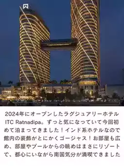 I'd been interested in this hotel for a while, and this was my first stay. As you'd expect from an Indian hotel, the interior is simply gorgeous! Beautifully decorated down to the last detail, it felt like an extraordinary world from the moment we arrived. The room was spacious, and the ocean view from the window gave me the perfect resort feeling. The infinity pool overlooking the ocean was also open, allowing me to relax in the heart of the city.