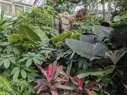 The Aquatic Garden in the fall offers a quiet, poignant beauty. The massive lily pads, though no longer blooming in their summer glory, sit quietly on the water's surface, edged with yellow and brown, alongside the fading lotus flowers. This area captures the gentle decline of the growing season perfectly. The slightly desolate, watery scene, combined with the reflection of the golden outdoor trees, creates a moody, reflective atmosphere that feels very appropriate for the transition toward winter. It's a peaceful spot for contemplation away from the crowds near the pumpkin displays.