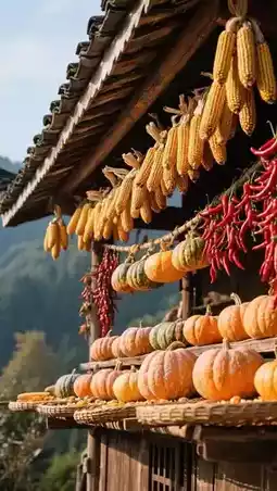 Visit Miao autumn drying scenes (pumpkins, corn, chili hanging from eaves)