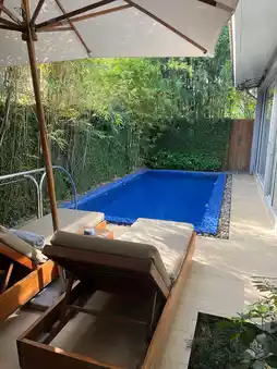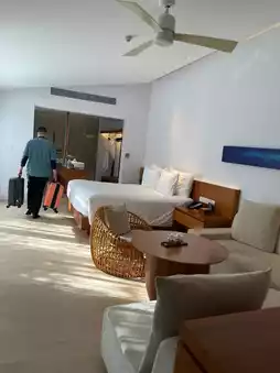๐ Our room was a villa with a private pool, and the three bedrooms were perfect for a family vacation. Each bedroom had its own large bed and private bathroom. The space was spacious, clean, and tidy, and it was really comfortable! The bed was soft and hard, and it was super comfortable to sleep on. The villa also had an area with a kitchen and living room, which was perfect for everyone to get together and eat and drink.
