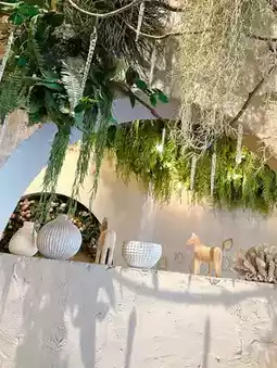 and the inside is decorated with cute teddy bears and plants covering the ceiling,