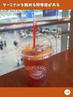 Highlands Coffee is located on the second floor of the airport. The restaurants in the departure area are a complete rip-off, so I recommend eating here. I had lemongrass tea, which was just the right amount of sweet and delicious! The staff was also kind.