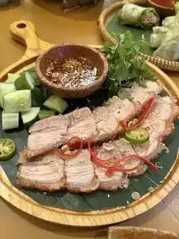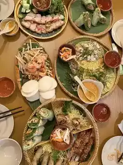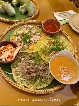 - Banh Xeo Thap Cam, which is a yellow dough that comes in a set. It's very delicious and has many toppings. The staff will recommend how to eat it.