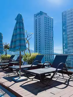 This is a nice accommodation located in My Khe Beach, Da Nang. It is an apartment-style hotel, and it has two rooms and two bathrooms, so it was great to use them all together. The view is also very pretty, and there is a swimming pool on the rooftop, so it is a great place to enjoy swimming while watching the sunset. I recommend a good value accommodation.