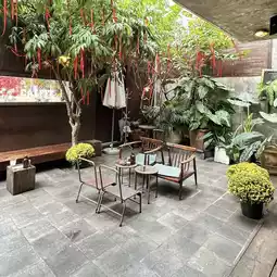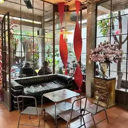 The shop has 2 floors. Whether it's the garden outside or the air-conditioned room in the building, you will feel the shade and the rustic mood that blend together. Wooden furniture, steel materials and large glass windows provide plenty of natural light ()
