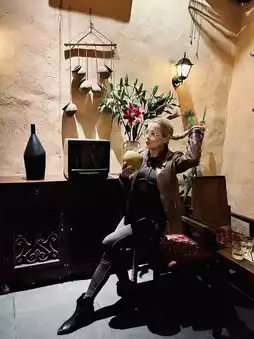 Yes, precisely the spot where the monkey got poisoned by a date. Right here in this café, where Moroccan rugs, cushions, fountains, and spicy scents transport you to another world. Plus, the surrounding green foliage feels equally jungle-like as in the famous film.