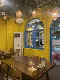 A stylish resort restaurant with a unified yellow and light blue color scheme!