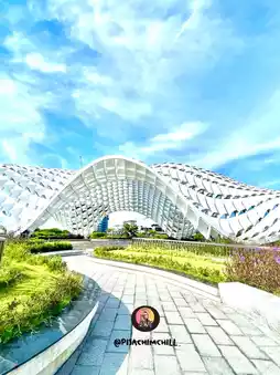 APEC Park with a giant white dome architecture, standing out surrounded by a garden, located on the banks of the Han River. This is one of the important landmarks
