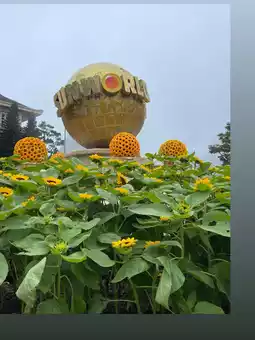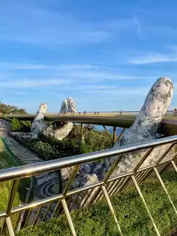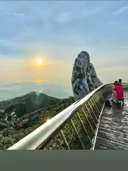 A popular photo spot is the Hand Bridge, a 150-meter-long golden yellow bridge with two giant white hands supporting the horizon, offering stunning views of the surrounding mountains and forests.