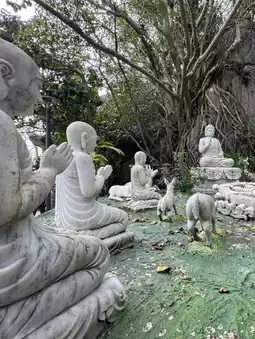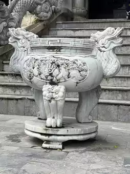 One of the most breathtaking artistic sights at Linh Ung Pagoda on Ngu Hanh Son is the stone sculpture depicting the Buddha's First Turning of the Dharma Wheel at Deer Park. This scene, drawn from Buddhist texts, depicts Shakyamuni attaining enlightenment beneath the Bodhi tree and then expounding the Four Noble Truths to five monks in Deer Park. It is considered the official beginning of the Buddhist teachings.