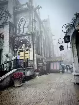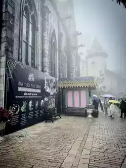 The most surprising thing about entering Ba Na Hills is the atmosphere reminiscent of a European town. Stone-paved streets, steeple-roofed churches, and small houses with stained glass windows exude a rich European romance. In the French Village area, the square and buildings create a sense of being transported to a medieval castle.