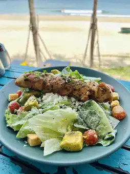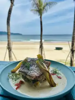 The menu mixes fresh Vietnamese seafood with Western comfort dishes. Start with crispy calamari (120K VND) or shrimp tempura (140K VND) — light, golden, and perfect with a cold beer 🍤🍺. The seafood platter (350K VND) is a showstopper — grilled prawns, clams, and squid brushed with butter and garlic, served right off the grill 🦑🔥. For mains, the grilled snapper with lime sauce (220K VND) or Esco burger (180K VND) hit all the right notes. Vegetarians will love the avocado salad (130K VND) or creamy pesto pasta (150K VND) 🥗🍝.
