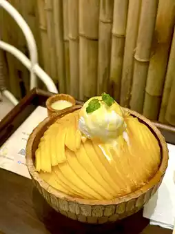Freshly sliced raw mango and smooth milk ice are paired with a generous helping of coconut ice cream and condensed milk,
