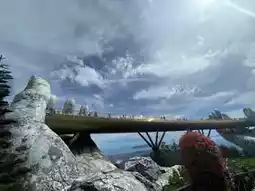 The bridge itself stretches about 150 meters in length. Its golden balustrades contrast beautifully with the moss-covered giant stone hands, creating a surreal atmosphere. On clear days, a sea of clouds unfolds, and during mornings or evenings, visitors can enjoy dramatic and picturesque scenes.