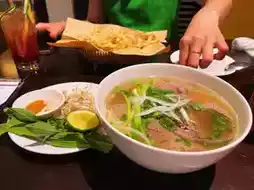 The classic pho bo (beef pho) features a clear broth with the refreshing addition of herbs and lime, creating a gentle yet robust flavor.