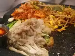"Ebang Chip" in Igok-dong, Seongseo district, Daegu, is a popular local yakiniku restaurant where you can enjoy thinly sliced pork belly (daebae samgyeopsal) grilled over charcoal. The thinly cut pork is crispy on the outside and juicy inside when grilled over charcoal. The pork's flavor is further enhanced when mixed with the special sauce and garlic.