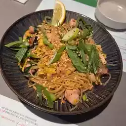 My order that day was salmon salad and Thai-style stir-fried noodles. The salmon salad was generously topped with thick, fresh salmon. The crunchy vegetables and refreshing dressing balanced the richness, creating a light and refreshing experience. The Thai-style stir-fried noodles were well-done with a sweet and salty sauce, and the bean sprouts and peanuts perfectly captured the local flavor. The chewy noodles provided a pleasant chew, and the subtle spiciness on the finish made it a dish I couldn't stop eating.