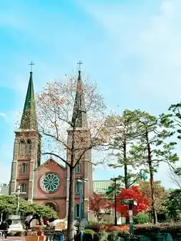 From a close-up, admire the church's spire, while the distant view interweaves with maple leaves and ginkgo trees, creating a truly retro atmosphere.