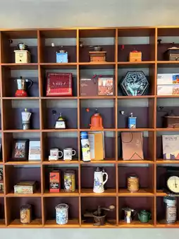 The shop houses a collection of antiques, including a mechanical coffee roaster, an antique porcelain-topped coffee grinder, an old moka pot, and even Soohyungdang, a 1946 establishment known for its apple bread. The shell-encrusted gift boxes create the illusion of stepping back in time.